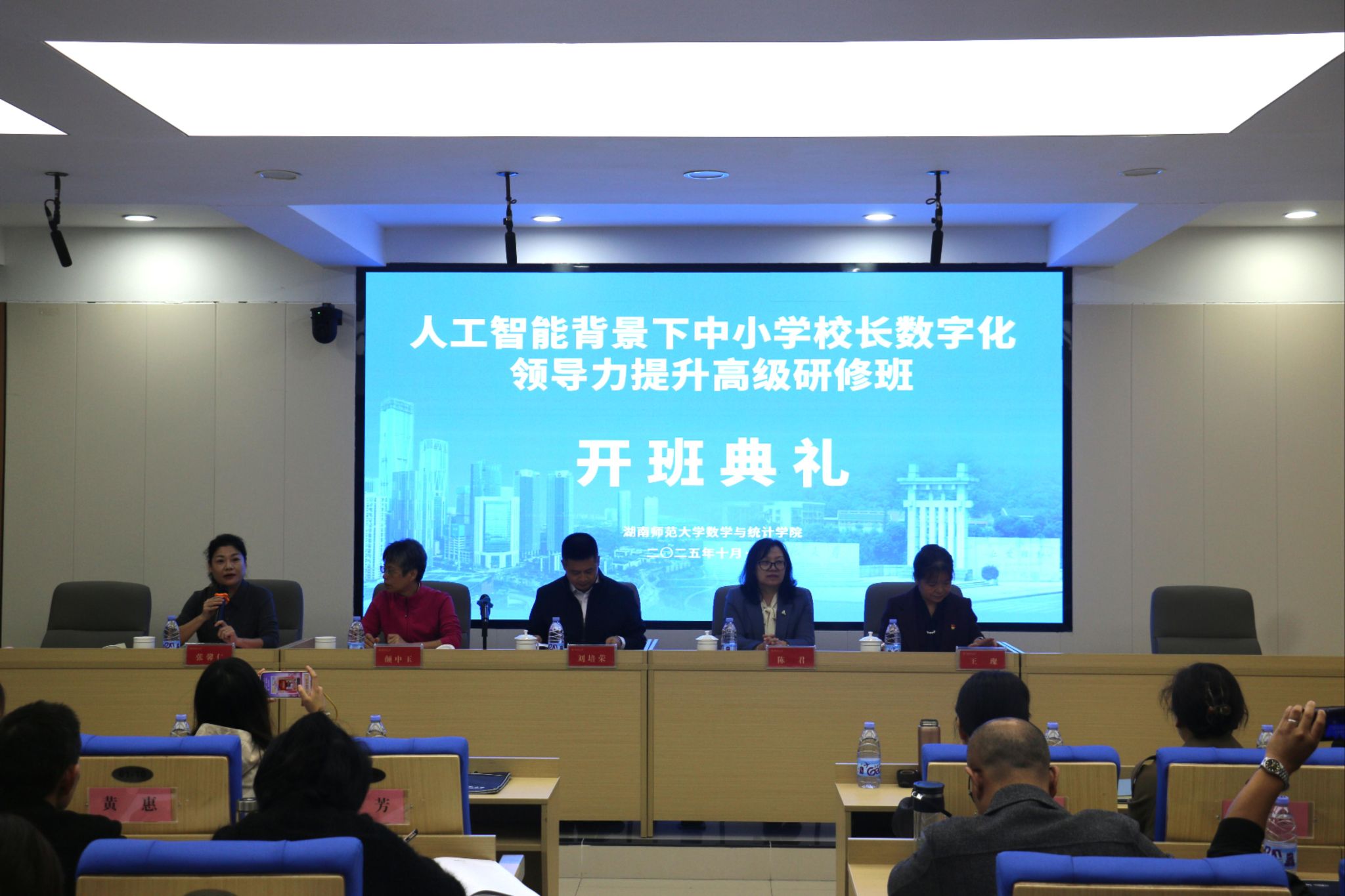 为深入贯彻落实国家教育数字化战略行动,全面提升中小学校长数字领导力,构建适应智能时代的育人新生态,2025年10月20日,由湘潭市雨湖区教育局主办、湖南师范大学数学与统计学院承办的“人工智能背景下中小学校长数字化领导力提升”高级研修培训在在湖南师范大学拉开帷幕。雨湖区教育局党委书记、局长刘培荣,雨湖区教育局教育研究培训中心主任张馨仁、党支部书记王璨、湖南师范大学数学与统计学院党委书记,以及来自雨湖区各中小学50余名校长参加了开班仪式,仪式由数学与统计学院行政副院长陈君主持。