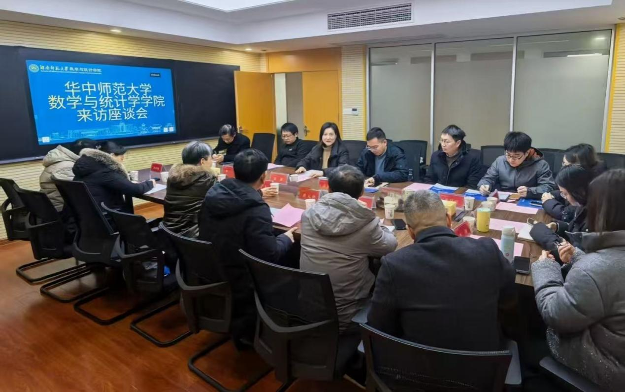 1月22日上午9:00,华中师范大学数学与统计学学院党委书记张静和院长郭玉劲带队,副院长李波、教授段然等一行7人莅临我院,围绕人才培养、社会服务、创收工作开展专题调研交流。院党委书记颜中玉、科研副院长黄元秋、行政副院长陈君、系主任、各科室主任热情接待,双方深度座谈共促发展。