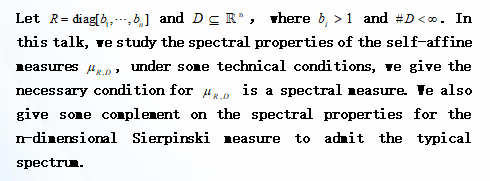报告人简介: 颜志辉,中山大学博士,现广西大学助理教授,研究方向为“分形谱测度理论及Gabor正交基理论”,目前已在Appl. Comput. Harmon. Anal.、 Constr. Approx.、Nonlinearity.、J. Approx. Theory.等发表多篇论文,主持中央高校项目(已结题)、中国博士后面上项目(已结题)、广州市科研项目(已结题)、青年科学基金(在研)、广西省青年科学基金(在研)。